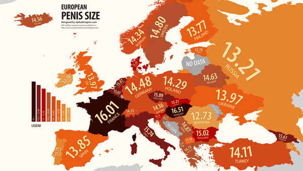 在「陰莖長度地圖」中,歐洲男人大多在12公分以上,其中最為「突出」的是匈牙利猛男,他們的平均長度為16.51公分;其次為法國浪漫男,他們的長度也有16.01公分。至於全歐最「短」的,則是羅馬尼亞男人,平均12.73公分。