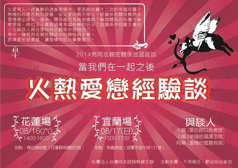 【花蓮宜蘭/講座】140816-0817【2014男同志親密關係巡迴】當我們在一起之後…火熱愛戀經驗談